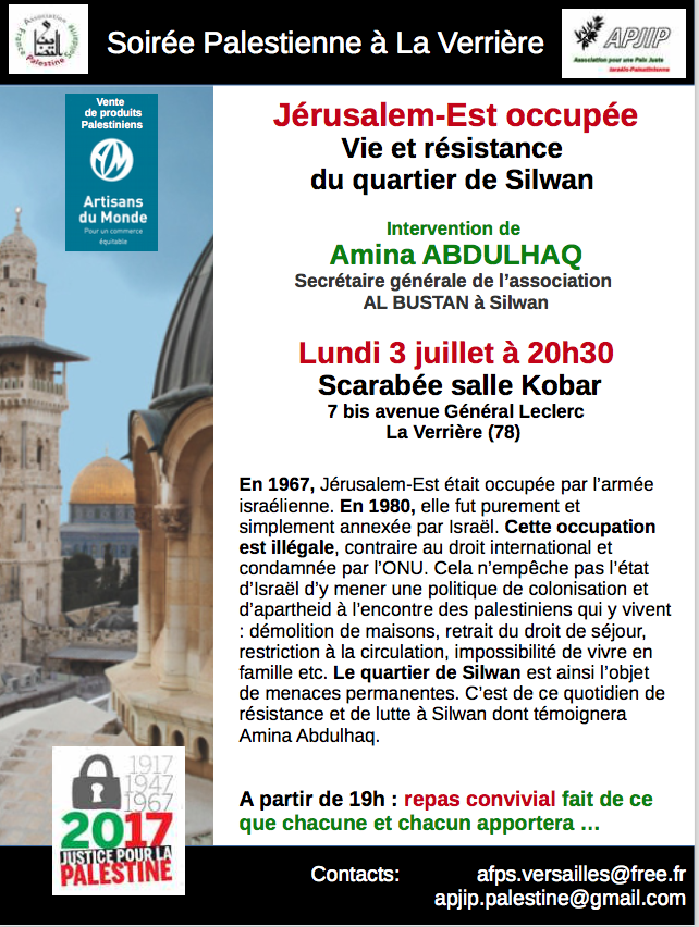 Le 4 juillet l’APJIP (Association verrièroise pour Une Paix Juste entre Israéliens et Palestiniens) , l’AFPS78 (Groupe local de France Palestine Solidarité) se sont associées pour proposer une soirée sur l’occupation et la « dé-palestinisation » de Jérusalem-Est occupée depuis 50 ans.