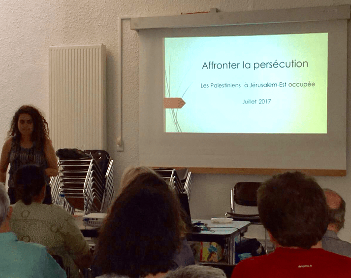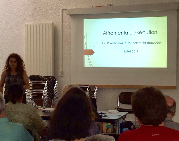 Nous avons eu la chance d’écouter le témoignage d’Amina Abdulhaq de l’association Al Bustan duquartier de Silwan. Juriste palestinienne elle nous a expliqué les rouages du mécanisme de domination israélien. Depuis l’annexion de Jérusalem-Est en 1967, Israël mène une politique visant à expulser les Palestiniens qui y vivent pour les remplacer par des colons juifs. Pour cela, l’Etat israélien a bâti un système législatif coercitif dont le but est d’affaiblir les Palestiniens.