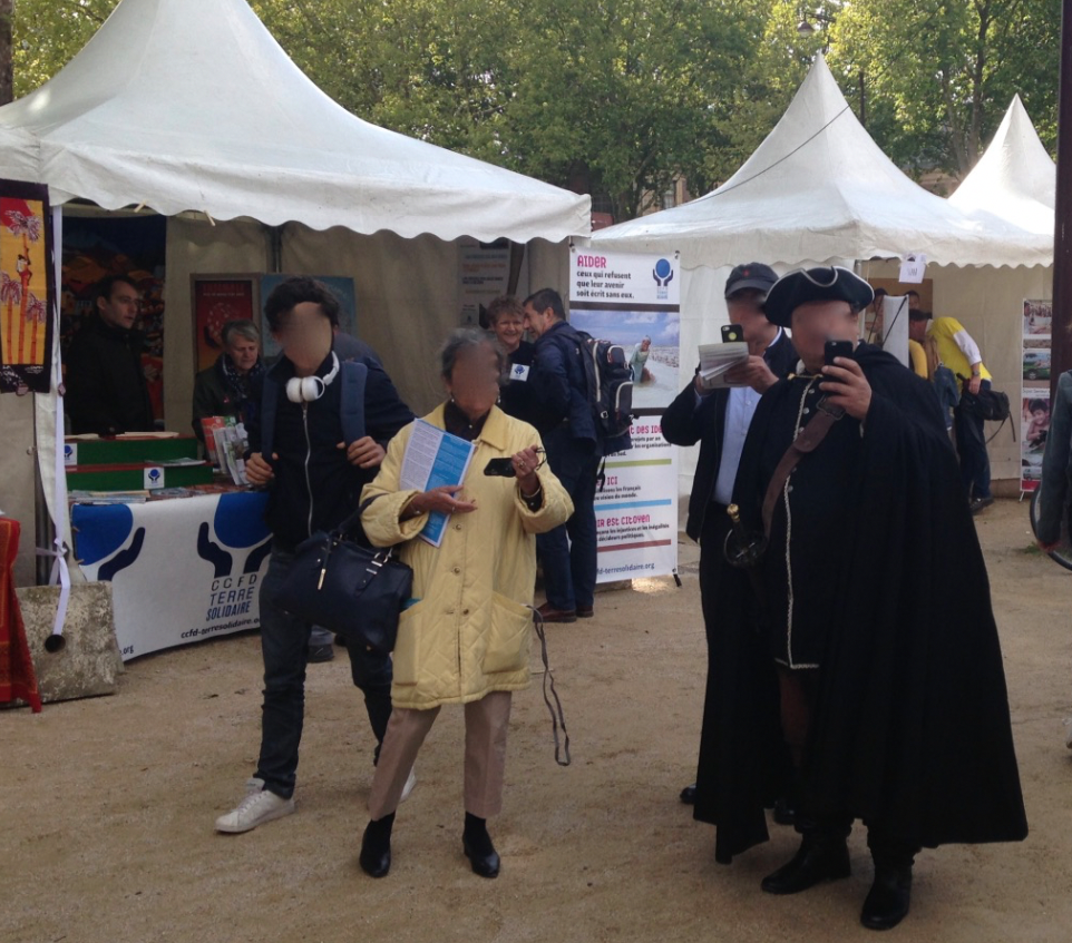 Parmi le groupe de ces vigies si attentifs à nos moindres gestes, nous avons reconnu « Louis 13 », proverbial visiteur de notre stand l’an passé et encore une fois costumé (le goût des masques, sans doute).