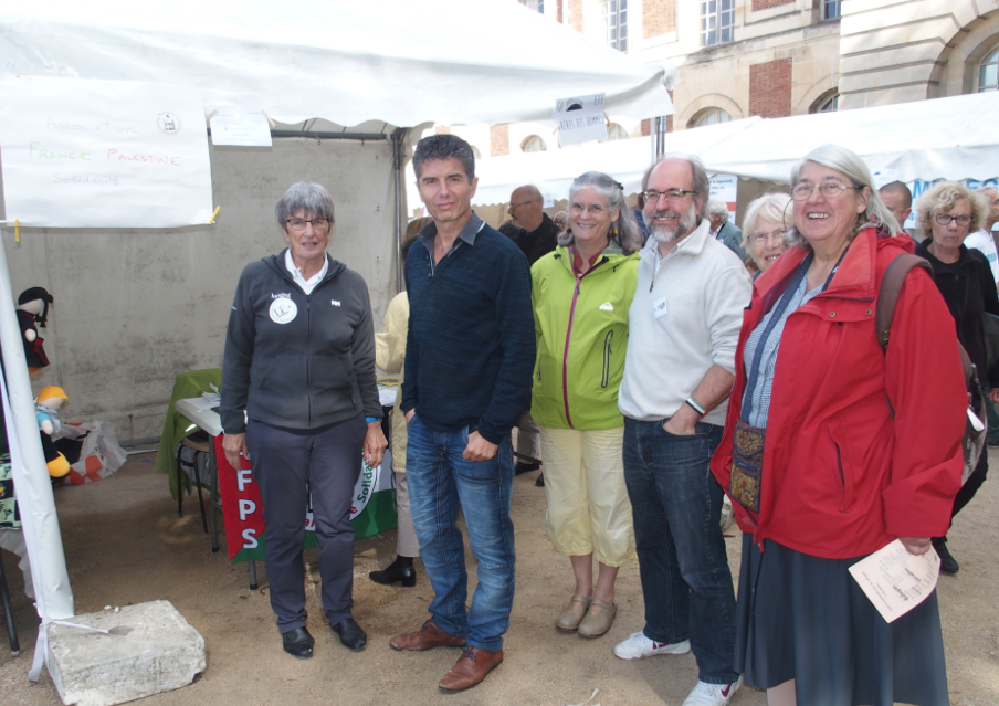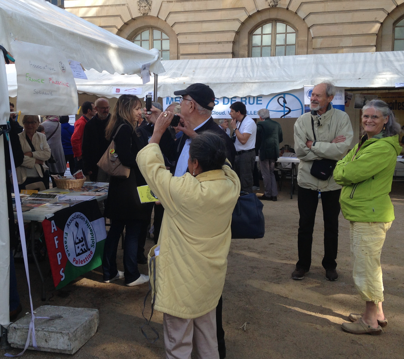Il ne fallut pas longtemps avant qu’un représentant de la mairie vienne nous demander poliment de ne pas rester sur les lieux. Mais entouré par près de dix personnes, il comprit que nous faisions corps, et que ce corps ne bougerait pas. Certain que nous serions agressés tôt ou tard, il espérait même ne pas avoir à appeler la police dans la journée. Il revint nous voir régulièrement, sans doute autant pour vérifier que tout allait bien que nous surveiller. Il fallut donc attendre la seconde partie de la matinée pour mesurer la réalité de la « menace » qui faisait trembler la municipalité. Six à sept personnes tenant conciliabule restèrent à bonne distance de notre stand pendant un long moment, nous mitraillant avec leurs téléphones portables. Nous pouvons ici affirmer sans crainte que le stand E33 de l’AFPS Versailles fut le plus photographié de l’histoire du Forum des associations. Personne n’osa pourtant venir nous accoster, et pour cause : nous étions une bonne vingtaine devant le stand, présidente, adhérents, sympathisants et ami(e)s. Un joli moment d’union qui a peut-être désamorcé toute velléité vindicative. À noter aussi la présence d’Emmeline Fagot, de l’Union juive française pour la paix (UJFP), venue spécialement de Saint-Ouen-L’Aumone pour nous soutenir. Qu’elle en soit ici remerciée.