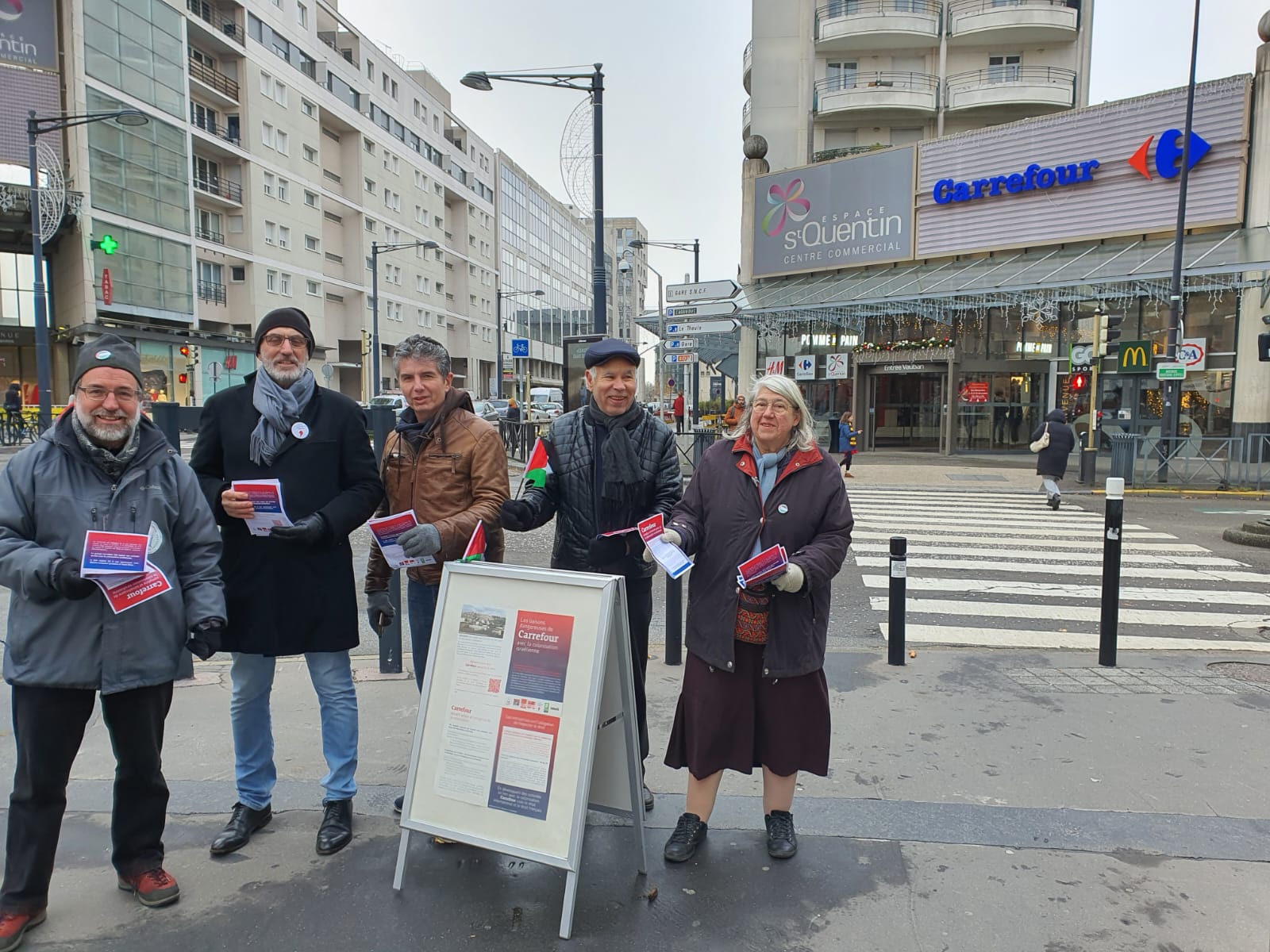 Samedi 3 décembre 2022, nous étions présents devant les différentes entrées du Carrefour de Montigny-le-Bretonneux pour dénoncer les liaisons dangereuses de l’hypermarché avec la colonisation israélienne. Le groupe Carrefour a en effet signé un accord de franchise avec deux sociétés israéliennes faisant du commerce dans les colonies illégales implantées en Palestine. Electra Consumer Products et Yenot Bitan pourront dorénavant vendre les produits de la marque française dans leurs magasins, un partenariat pour lequel Carrefour viole le droit international et le droit français. Malgré un froid mordant, les membres de l’AFPS 78 ont distribué 800 tracts dans un souci d’informer et de dialoguer. Ils ont suscité nombre de réactions positives, et à minima beaucoup d’intérêt, et rencontré peu d’opposition. À noter que le directeur du Carrefour n’a pas répondu au courrier que nous lui avons adressé.