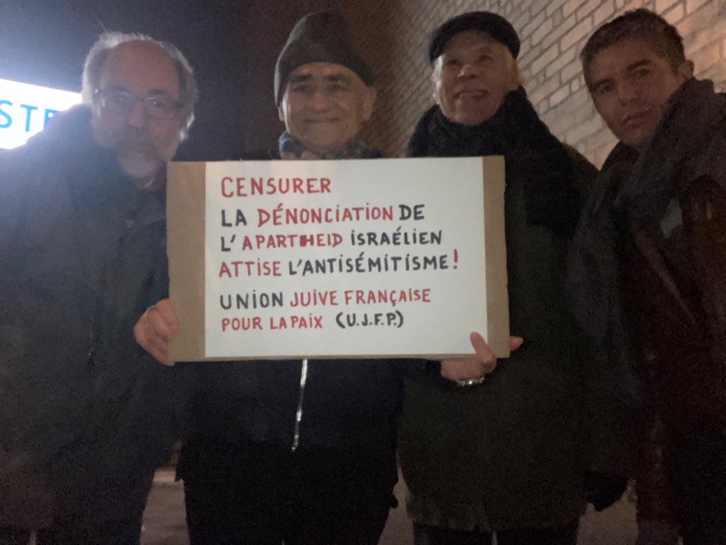 Le 12 décembre suivant à 20h30, l’AFPS était présent devant les locaux du Centre huit, près de Versailles Chantiers, pour manifester sa colère suite au refus de ses dirigeants de nous louer leur salle pour notre conférence sur l’apartheid organisée avec Amnesty, comme nous le relations dans notre précédent article. En présence des autres associations partenaires et notamment de l’UJFP (Association des Juifs français pour la paix), nous avons ainsi une nouvelle fois fait marquer notre présence, sur le même mode que le 14 octobre dernier, suite à l’interdiction au dernier moment de la soirée par la paroisse du Chesnay dans sa salle Jean XXIII. À noter que le directeur du Centre huit, à qui nous avons demandé un entretien, refuse de nous recevoir.