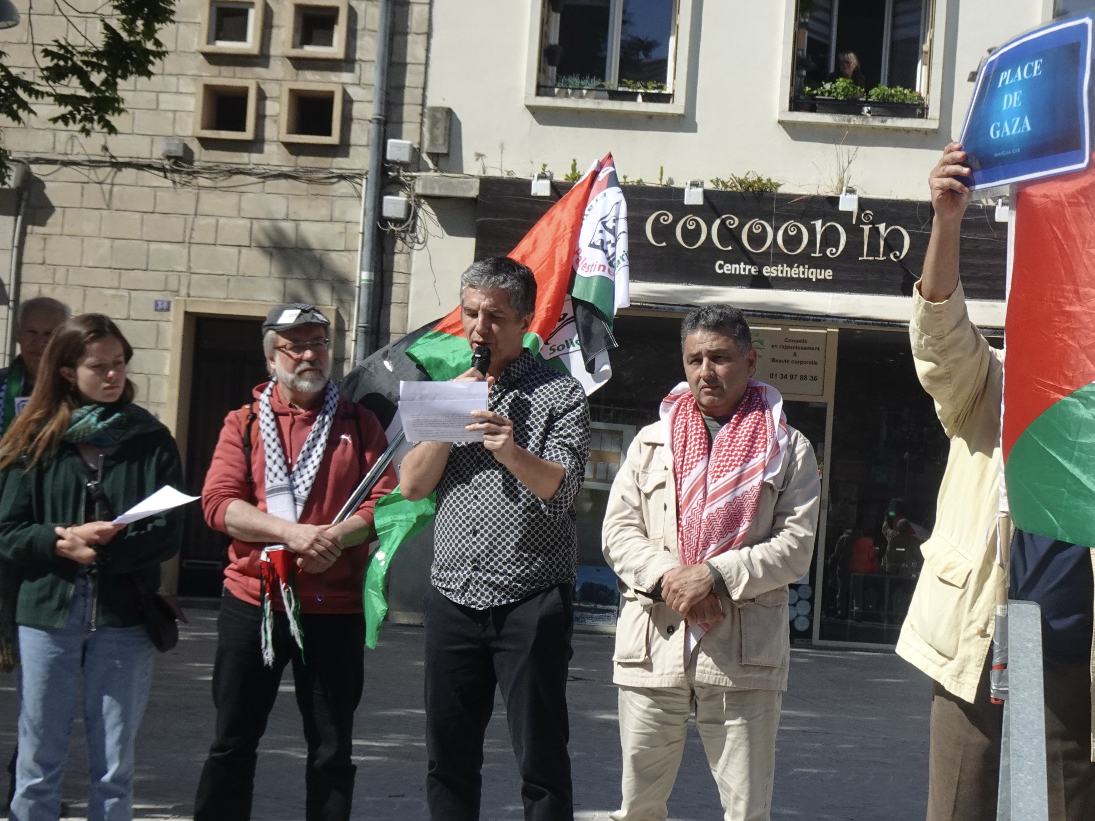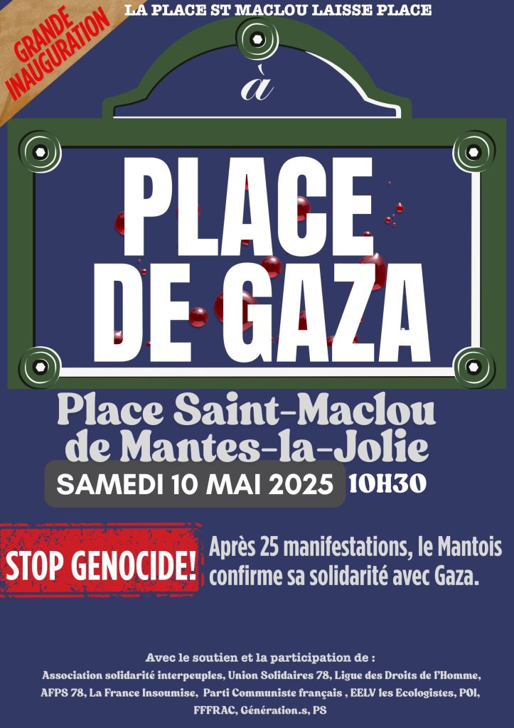 Avec le soutien et la participation de :Association solidarité interpeuples, Union Solidaires 78, Ligue des Droits de l’Homme, Association France Palestine Solidarité 78, La France Insoumise, Parti Communiste français, EELV les Ecologistes, POl, FFFRAC, Cénération.s, PS