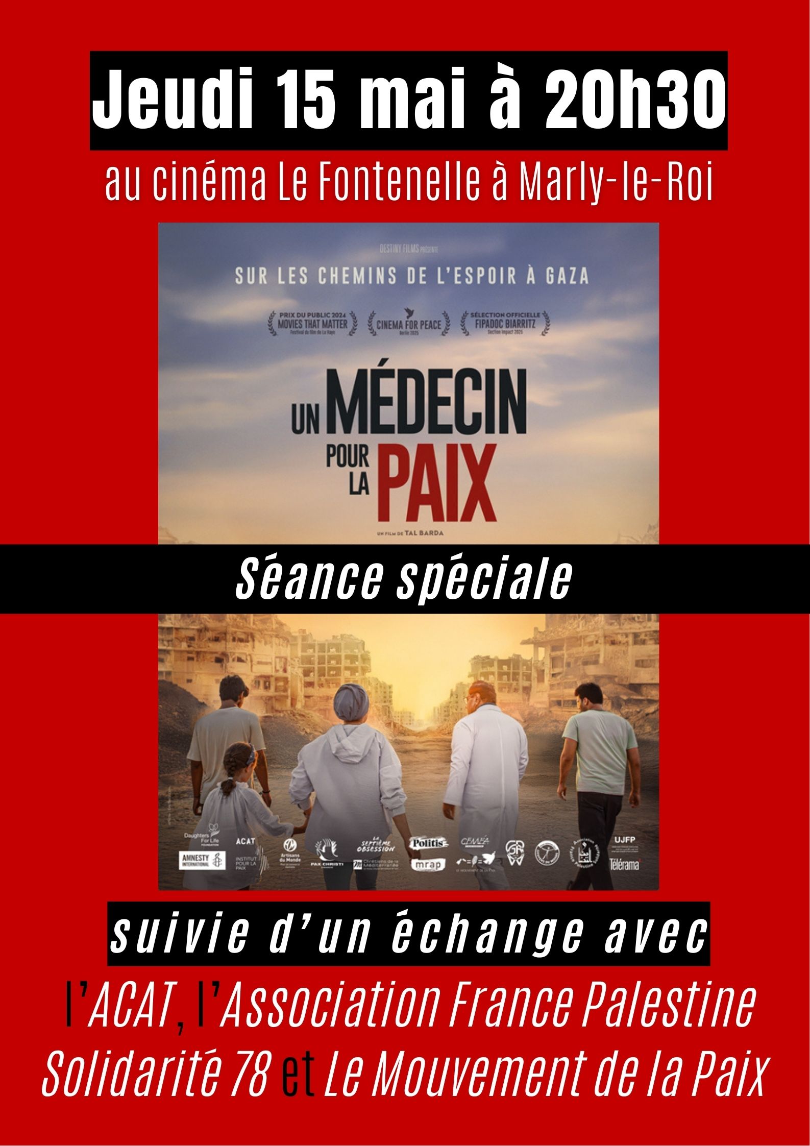La projection du documentaire sera suivie d’un échange avec l’ACAT, l’Association France Palestine Solidarité 78 et le Mouvement de la Paix.